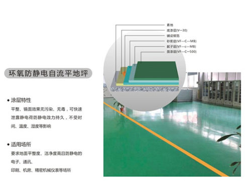 環(huán)氧樹脂防靜電地坪具有表面平整,美觀,整體無縫,易清潔,易維修,防靜電效果長期持久有效,造價低等特點(diǎn),可廣泛適用于電子電器制造,微機(jī)計(jì)算機(jī)精密設(shè)備,電氣控制,印刷,紡織,軍工等一切需要防靜電或防爆場所的地面涂裝。