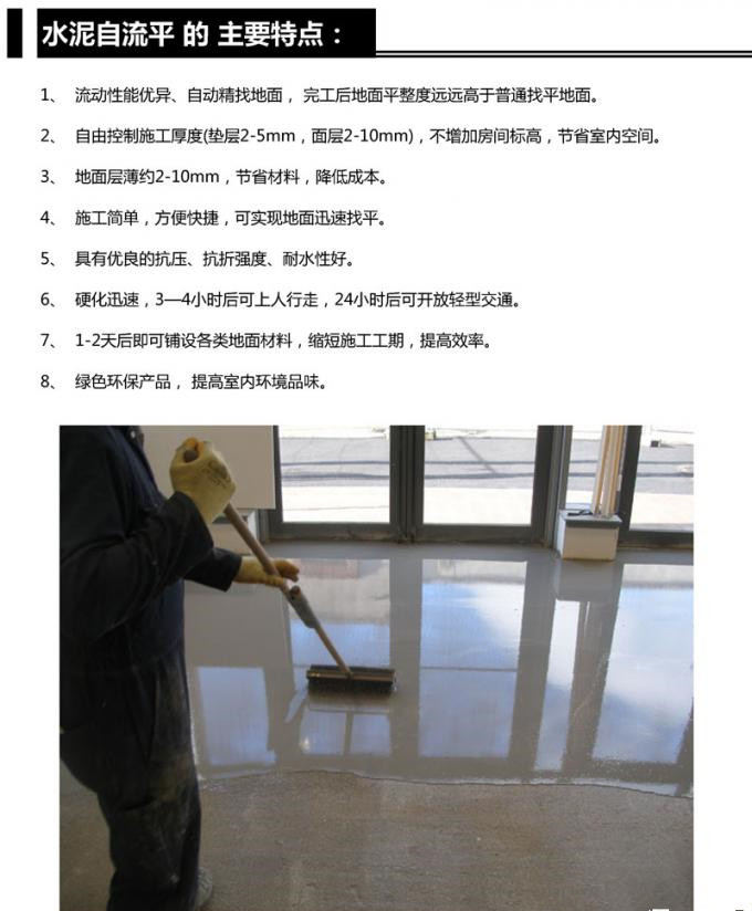 水泥自流平是一種科技含量高、技術(shù)環(huán)節(jié)復(fù)雜的高新綠色產(chǎn)品.是由多種活性成分組成的干混型粉狀材料,自流平是一種地面施工技術(shù),它是由多種材料同水混合而成的液態(tài)物質(zhì),倒入地面后,這種物質(zhì)可根據(jù)地面的高低不樣順勢(shì)流動(dòng),對(duì)地面進(jìn)行自動(dòng)找平,并能很快干燥,固化后的地面會(huì)形成光滑、平整、無(wú)縫的新基層。